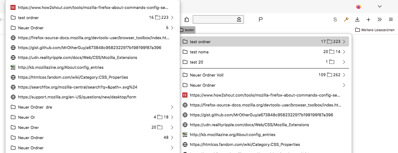 Mir ist das ehrlich gesagt zu unübersichtlich. Es wimmelt von Symbolen und dann auch noch immer die gleichen. Ich verwende ein anderes Skript, das mir in einer gesonderten Zeile oben im Untermenü die Anzahl der Ordner, die Anzahl der Links (Lesezeichen) und die Möglichkeit angibt, die Links in Tabs zu öffnen.