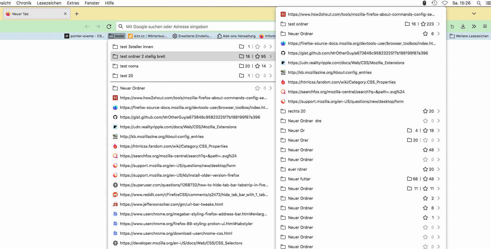 In diesem Fall ist das mein - wenig realistischer - Test Setup im Testprofil, der teils Dutzende Lesezeichenordner mit keinen Ordnern und/oder keinen Lesezeichen drinnen hat; also eine Menge Pseudoelemente mit opacity < 1.