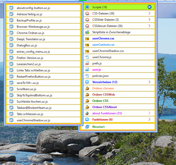 Wenn Du alles eingerichtet hast, die Scripte werden alle angezeigt ( Script-Cache löschen nicht vergessen), dann gehe mal auf den Button vom extras_config_menu.uc.js und rufe die userChrome.css auf. Es öffnet sich ein Fenster, sinngemäß so wird erklärt dass die Datei nicht vorhanden ist und ob sie neu angelegt werden soll. Das musst Du mit ja betätigen, die Datei offen lassen, den Ordner chrome öffnen, Doppelklick auf die userChrome.css und den kompletten Inhalt kopieren und in die offene andere Datei einfügen und speichern. Neustart, dann kann die Datei wieder aufgerufen werden.