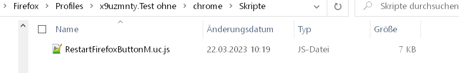 Ich habe alle Skripte im Unterordner "JS" (der muss natürlich auch in der userchrome.js stehen) und die CSS-Dateien im Unterordner "CSS".