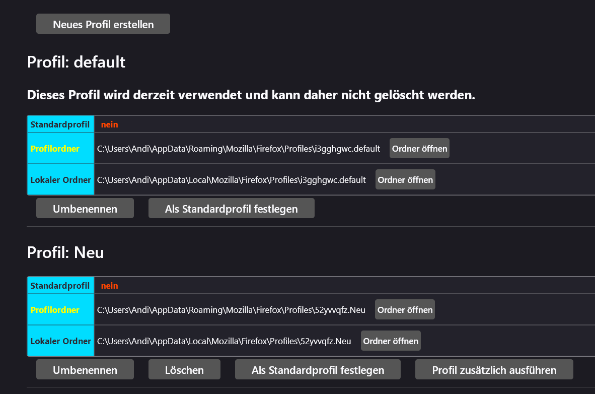 • Woher kommt diese Einschätzung? Firefox spricht keine Warnung aus, wenn man ein zweites Profil gleichzeitig startet. Auf welcher Basis sollte ein Nutzer davon ausgehen können, dass das nicht vorgesehen ist und woher hast du diese Gewissheit?