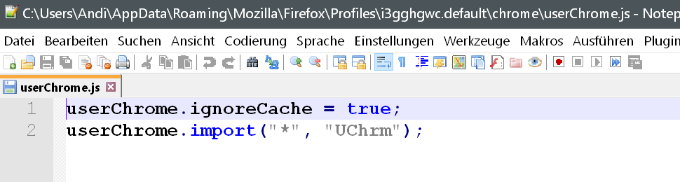 Ich habe mir den Code von 2002Andreas aus der ersten Seite dieses Threads kopiert. Danach eine leere Textdatei erstellt, den Code dort eingefügt und die Datei als aboutconfig-button.uc.js im Ordner Chrome abgespeichert. Soweit richtig? Ahja, bervor ich's vergesse, den Pfad aus Zeile 19 des Codes habe ich natürlich angepasst, der sieht so aus: