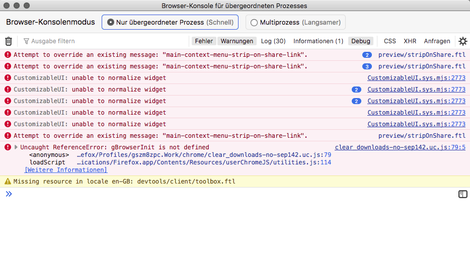 ; hier der Error in der Konsole:CustomizableUI: unable to normalize widget hatte ich schon vorher mal in der Konsole gesehen, war mir aber nicht sicher ob es mit dem Script zusammenhängt.