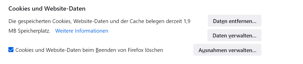 • ob du nur Cookies oder auch Website-Daten beim Beenden von Firefox löschen lässt.
