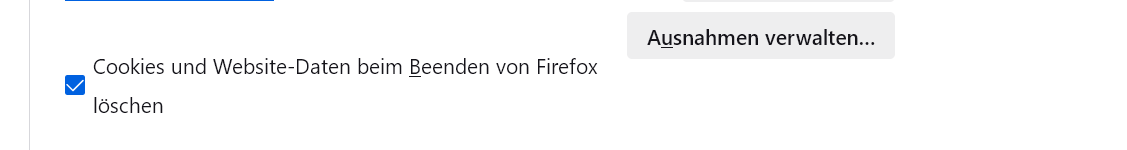 Das beantwortet nicht die Frage, aber dieser Punkt hat bei mir auch noch Fragezeichen, weil ich die Erklärung von Andreas einst nicht wirklich verstanden habe. Es gibt ja einmal "unten" [_]Die Chronik löschen, wenn Firefox geschlossen wird -> Cookies etc. Und "oben" [_]Cookies und Website-Daten beim Beenden von Firefox löschen.