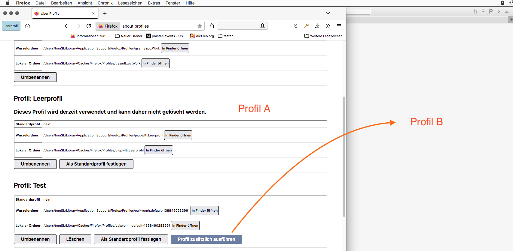 Wenn ich über about:profiles ein zusätzliches Profil öffne, mit Profil zusätzlich ausführen, erscheint dieses Profil hinter dem Ursprungsprofil.