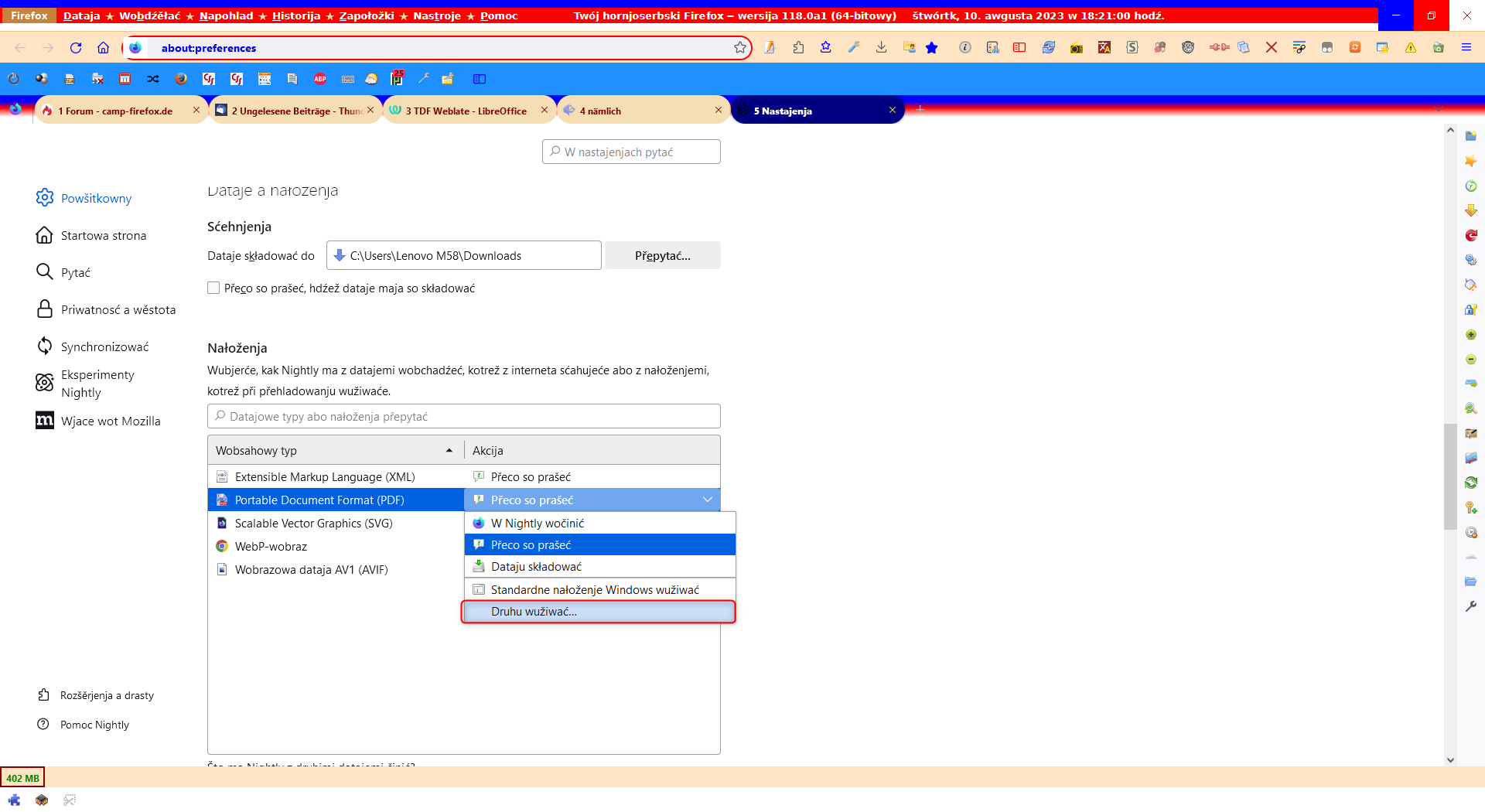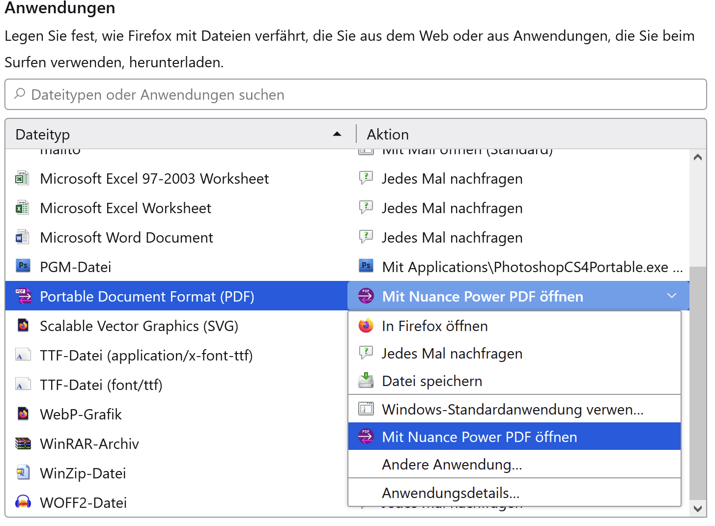 Mir geht es darum, PDF-Dateien aus dem Internet downloaden zu können, die dann mittels einer Einstellung im Browser direkt mit meiner installierten App NuancePDF.exe gestartet werden können. Bis Ende Juli hatte ich mit Firefox damit KEIN PROBLEM!