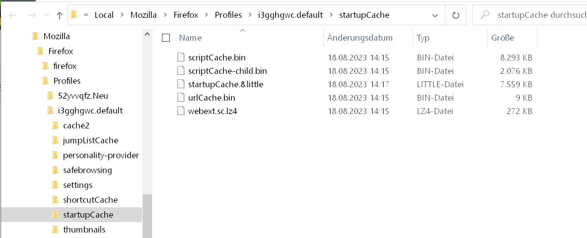 Hm, ich denke, das das der falsche startupCache-Ordner ist, meinst Du nicht eher den startupCache-Ordner auf der obersten Ebene des Profils sprich den ↓?