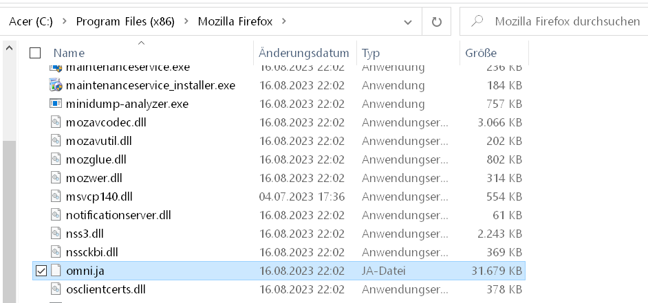 Du musst aufpassen: Es gibt zwei Dateien namens omni.ja: eine im Wurzelverzeichnis und eine im Unterordner browser.