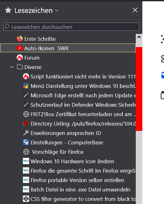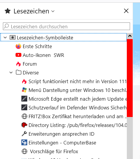 Wenn die Boomarks Sidebar mehr Einträge hat als der Monitor hoch ist erscheint auf der rechten Seite der Sidebar ein Scrollbalken.
