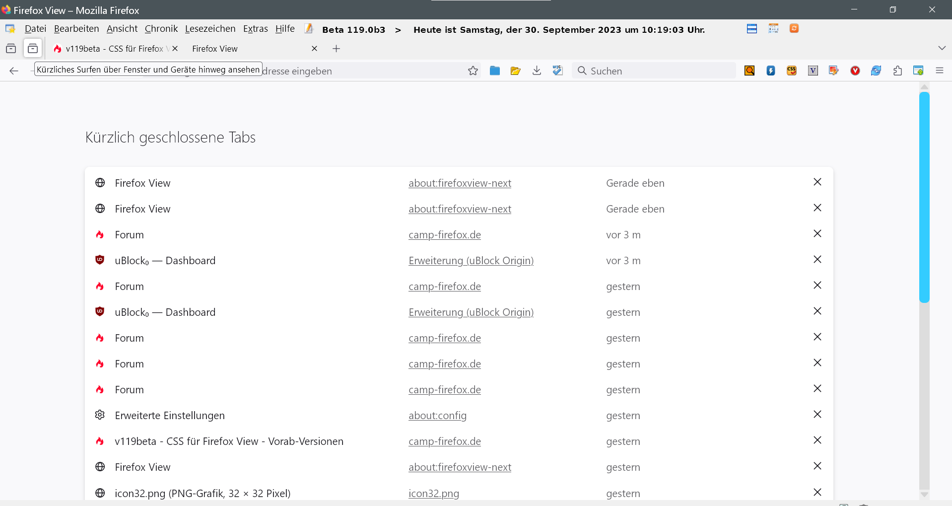 Alles anzeigen@-moz-document url(about:firefoxview-next) { .main-container { margin-top: 10px !important; } card-container:nth-child(2), card-container:nth-child(3) { display: none !important; } #pages { min-width: 1300px !important; } /* Background */ body { background-color: #eeeeee !important; } [data-l10n-id="firefoxview-collapse-button-hide"]:hover { background-color: #FDB0A4 !important; } body > fxview-category-navigation:nth-child(1) { display: none !important; } .sticky-container.bottom-fade { display: none !important; } .fxview-tab-row-title { min-width: 620px !important; max-width: 620px !important; } .fxview-tab-row-url, .fxview-tab-row-time { min-width: 200px !important; max-width: 200px !important; } }Es gibt noch einen Schritt für die "Release"-Version - so dass Sie beim Öffnen von Firefox View nicht mehr auf View All klicken müssen. Mit anderen Worten: FVN sollte sich öffnen, wenn die Schaltfläche "View All" bereits angeklickt ist.