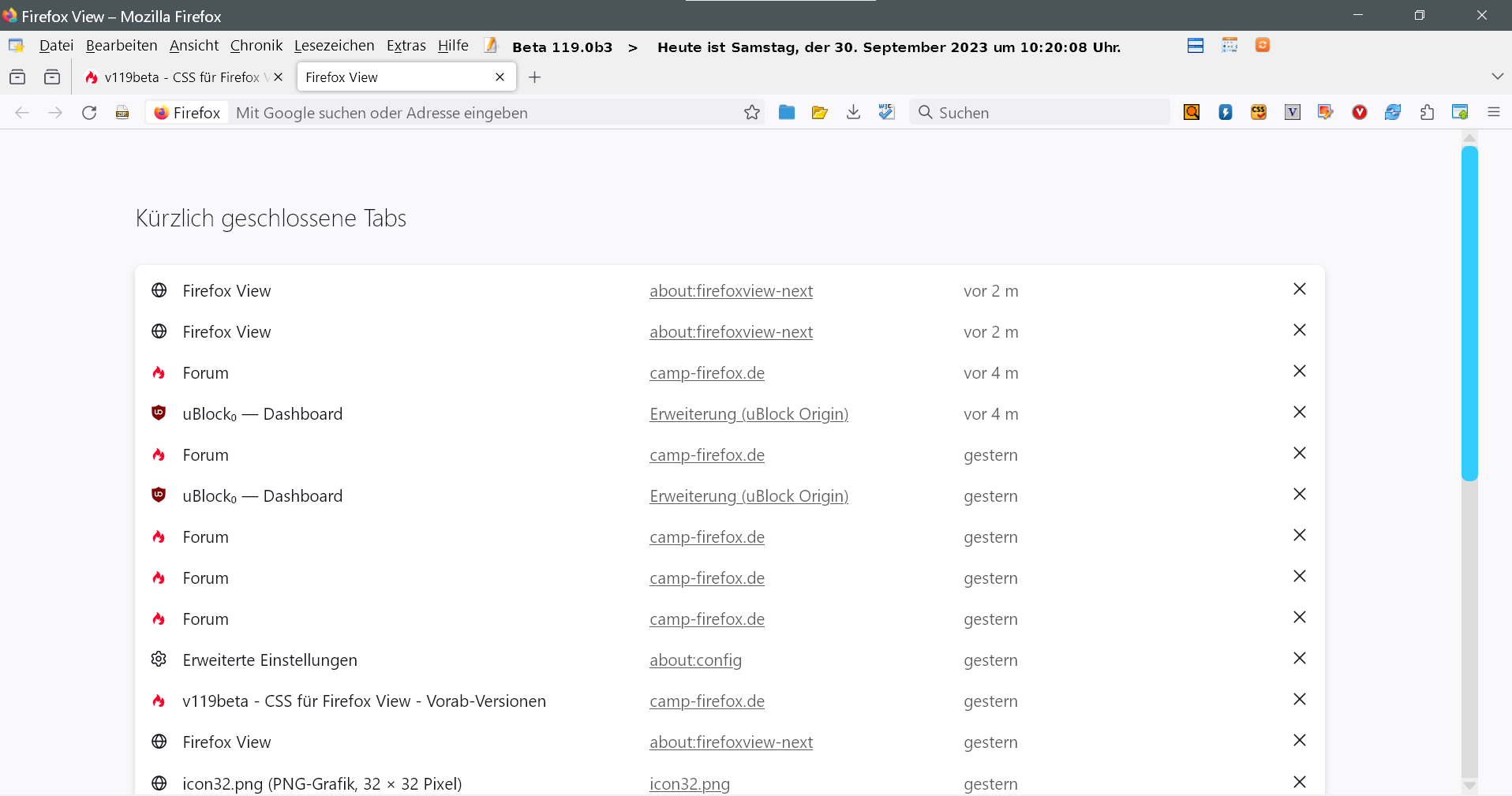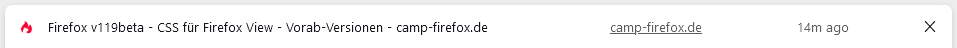 Alles anzeigen@-moz-document url(about:firefoxview-next) { .main-container { margin-top: 10px !important; } card-container:nth-child(2), card-container:nth-child(3) { display: none !important; } #pages { min-width: 1300px !important; } /* Background */ body { background-color: #eeeeee !important; } [data-l10n-id="firefoxview-collapse-button-hide"]:hover { background-color: #FDB0A4 !important; } body > fxview-category-navigation:nth-child(1) { display: none !important; } .sticky-container.bottom-fade { display: none !important; } .fxview-tab-row-title { min-width: 620px !important; max-width: 620px !important; } .fxview-tab-row-url, .fxview-tab-row-time { min-width: 200px !important; max-width: 200px !important; } }Es gibt noch einen Schritt für die "Release"-Version - so dass Sie beim Öffnen von Firefox View nicht mehr auf View All klicken müssen. Mit anderen Worten: FVN sollte sich öffnen, wenn die Schaltfläche "View All" bereits angeklickt ist.