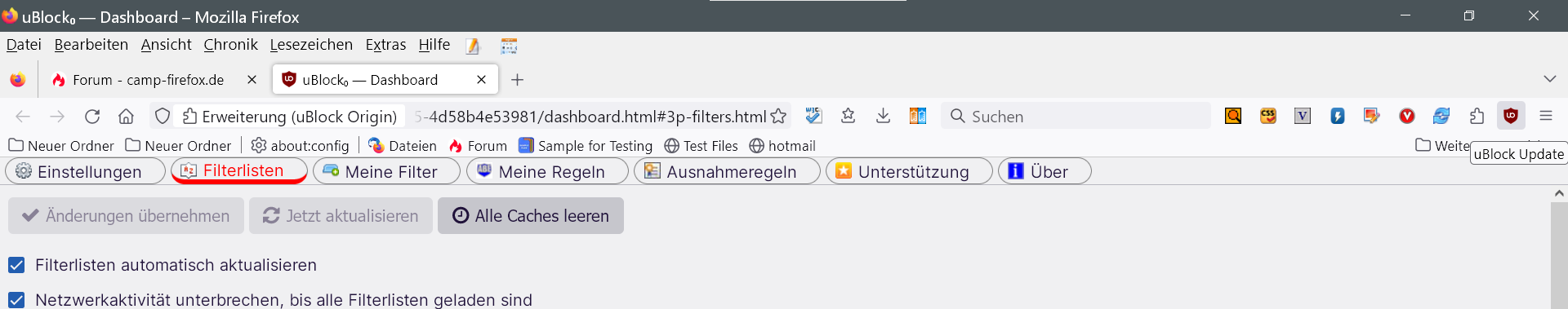 Wenn man in uBlock nach Updates suchen möchte, dann muss man entweder erst noch auf den Button: Erweiterungen und dann auf uBlock und dann noch auf Dashboard öffnen klicken. (Den Klick auf Erweiterungen kann man sich sparen, wenn ublock auf einer Symbolleiste ist)