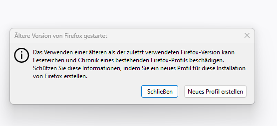 Die Fehlermeldung gibt es aber auch bei Firefox. Sie bedeutet, dass du ein Profil, das du mal mit einer älteren Thunderbird-Version genutzt hast, später mit einer neueren Thunderbird-Version verwendet hast und nun wieder mit der alten Thunderbird-Version verwenden willst. Das wird standardmäßig aus Sicherheitsgründen unterbunden. Ich nehme mal an, dass du ein Profil, dass du mit TB 102 genutzt und dann mit TB 115 verwendet hast, nun wieder mit TB 102 verwenden wolltest. Wie gesagt, das wird verhindert, du hast dann nur zwei Möglichkeiten: entweder abbrechen oder ein neues Profil anlegen. Ein solches Profil hat am Ende seines Namens eine Zahl. Oben in deinem Bildschirmfoto ist das also default-release-1.