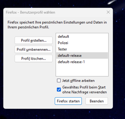 Zusätzlich habe ich noch über Profile im Firefox mein Profil default als Standardprofil gesetzt.