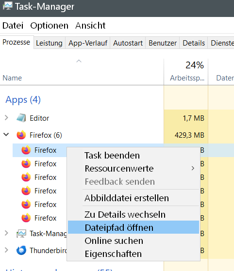 Ich kann im Taskmanager zwar Firefox finden, weiß aber nicht, wie ich den Pfad finde. ??