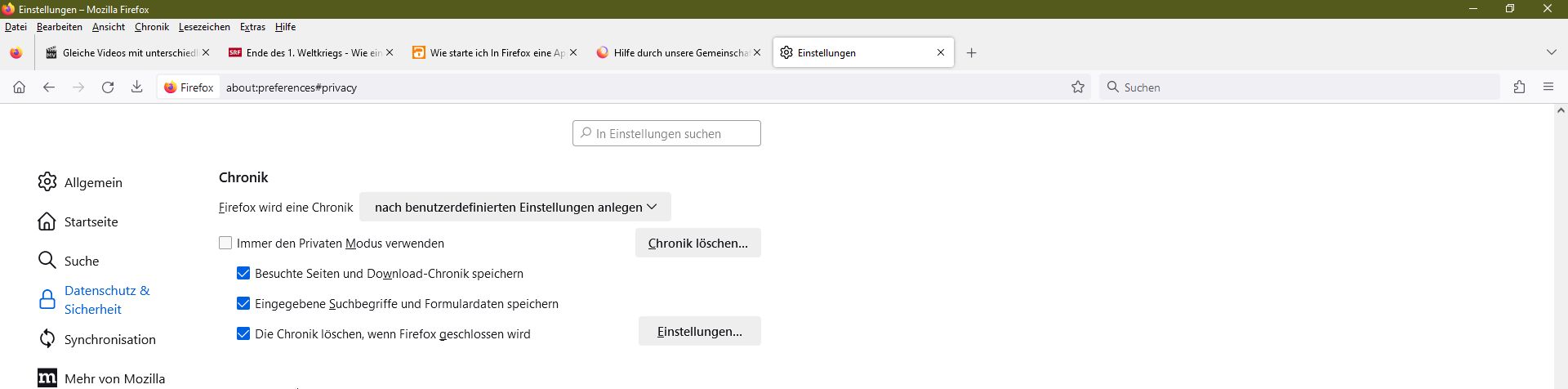 Ich habe mehrere Apps installiert. Die zugehörigen Symbole erscheinen aber nicht in der Symbolleiste. Zu der Frage, warum dies so ist, habe ich keine passenden Antworten gefunden. Daher der zweite Schritt und die Frage, wie ich ein solche App trotzdem nutzen/starten kann, wenn das entsprechende Start-Symbol in der Symbolleiste fehlt. Eine Hardcopy ist beigefügt; aus dieser ist u. a. auch ersichtlich, wie die Chronik eingestellt ist. Unter "Browser-Datenschutz" ist Standard aktiviert.