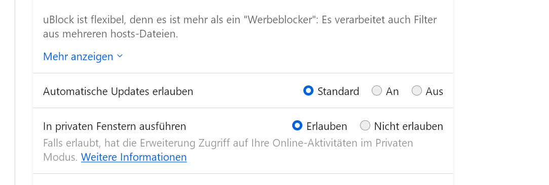 Wenn man eine Erweiterung installiert, dann muss man extra angeben, ob sie auch im Priivaten Modus aktiviert sein soll.