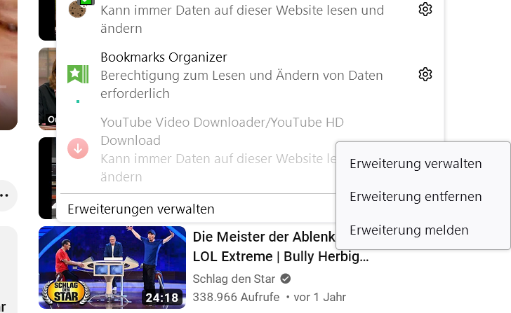 Habe eben die Apps "YouTube Video Downloader/YouTube HD Download" sowie "Convert4K.com YouTube Converter" installiert, weil ich das SRF Video "Wie ein Eisenbahnwaggon Geschichte schrieb" herunterladen möchte. Offensichtlich hat der Schweizer Fernsehsender jedoch ein anderes downloadbares Video-Format, denn die bisherigen Lade-Versuche schlugen fehl. Wenn ich den von Dir beschriebenen Weg beschreite, ist aber in dem Erweiterungs-Fenster zu lesen, dass keine Daten auf dieser Webseite les- oder änderbar wären; die Möglichkeit, das App-Symbol in der Symbolleiste abzulegen, wird nicht angezeigt. Unter "Erweiterungen verwalten" finde ich auch keine Möglichkeit. Beide Apps dürfen in privaten Fenster ausgeführt werden.