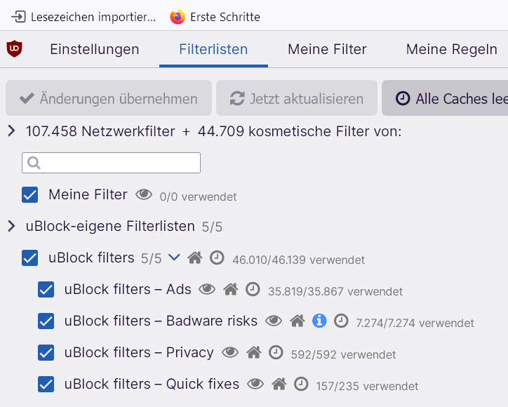 • Probiere in dem uBlock-Einstellungen die Caches zu leeren und neu aktualisieren. Dann am besten den Firefox mal neu starten.