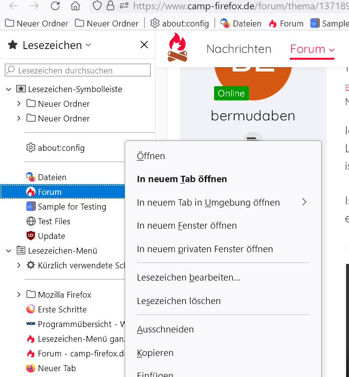Ich beobachte einen Bug im Lesezeichen-Sidebar seit dem Update auf Version 119. Wenn ich einen Link mit der Maus verschiebe oder auf einen Link rechtsklicke, dann wird er unsichtbar, d.h. das Icon ist noch vorhanden, aber der Text ist weg (siehe Screenshot). Und wenn ich einen Link lösche, dann wird der nächste oberhalb in der Liste unsichtbar.