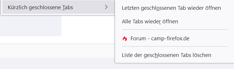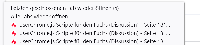 ich benutze folgendes Script hier aus dem Forum. Das Script listet kürzlich geschlossene Tabs auf und ermöglicht nach Klick auf den Listeneintrag die Wiederherstellung des entsprechenden Tabs: