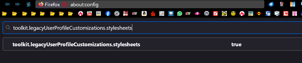Nun scrollt man runter bis zu besagter Zeile toolkit.legacyUserProfileCustomizations.stylesheets und stellt sie auf true, falls sie auf false stehen sollte. Man muss danach nichts abspeichern.