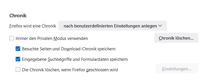 Meine Chronik wird plötzlich nicht mehr gespeichert, und auffällig ist, dass im Profilordner mehrere Dateien seit einem bestimmten Tag zur selben Uhrzeit sozusagen angehalten wurden und sich nicht mehr verändert haben. Das sind die Dateien: addonStartup.json.lz4, compatibility, ExperimentStoreData.json, extension-settings.json, favicons.sqlite-shm, parent.lock, places.sqlite-shm, sessionCheckpoints.json, storage.sqlite, webappsstore.sqlite-wal.