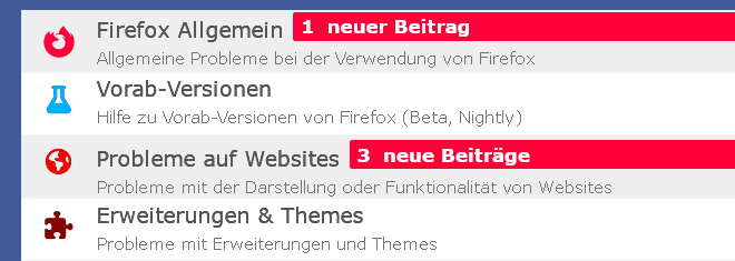 in der vorangegangenen Forumsversion hatte ich die Symbole der Unterforen auf der Startseite des Forums farblich angepasst. Grundlage für die Anpassungen waren .fa-Klassen. Statt ihrer wird jetzt das Element fa-icon verwendet, denen das Attribut name zugewiesen ist. Das klappt zum großen Teil, wenn man fa-icon[name] verwendet, z. B. fa-icon[name=gears] für die Schaltzentrale. Bei drei Symbolen klappt die Anpassung nicht, und zwar für Fiefox Allgemein, Firefox-Produkte für Android und Firefox-Produkte für iOS. Ich habe herausgefunden, dass alle drei mit fa-icon[name=folder-open] definiert sind. Dadurch kommen sie sich offenbar ins Gehege. Auch mit der Selektorketten-Variante funktioniert es nicht, obwohl die sich unterscheiden: