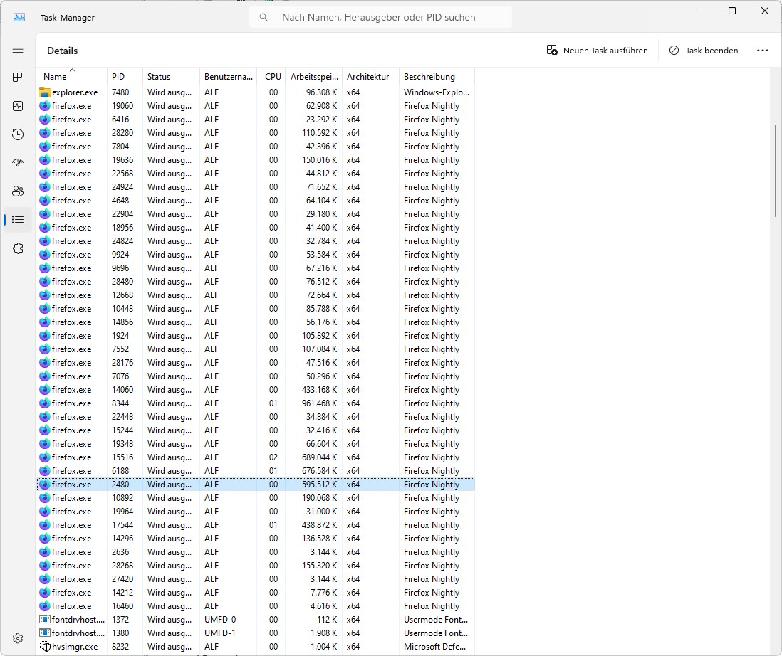 durch Zufall (Ursachenforschung langsames Verhalten von FF) habe ich im Taskmanager (Prozesse) mal den Resourcenverbrauch von FF gesehen und war etwas überrascht. ca. 500-600MB für ein "leeres" FF-Fenster. Und hinter Firefox steht im Taskmanager eine Zahl in Klammern, (z. B. anfangs "Firefox (10)", obwohl nur ein Fenster offen ist.)