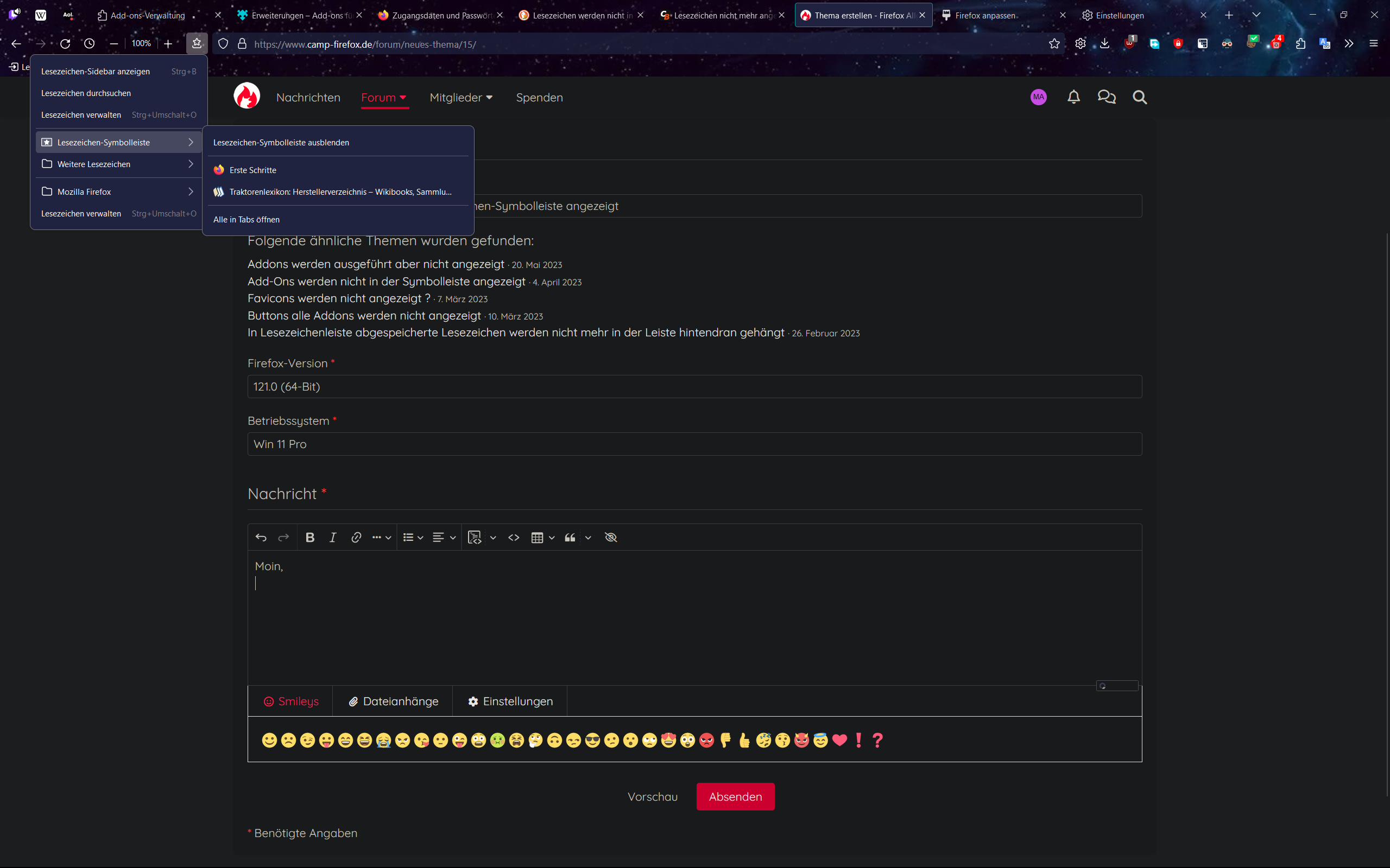 dass meine Lesezeichen-Symbolleiste nicht ordnungsgemäß funktioniert und ich nicht nur für deren Bedienung, sondern auch zum Finden eines schon aufgezeigten Lösungsweges zu doof bin..^^