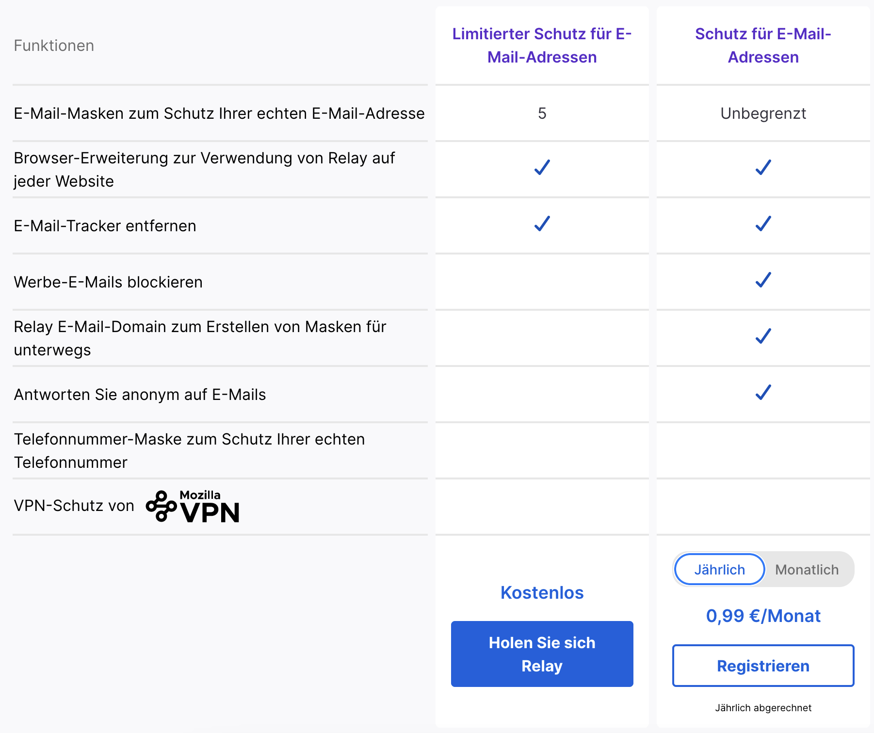 Siehe auch Vergleichstabelle auf der Website von Firefox Relay: