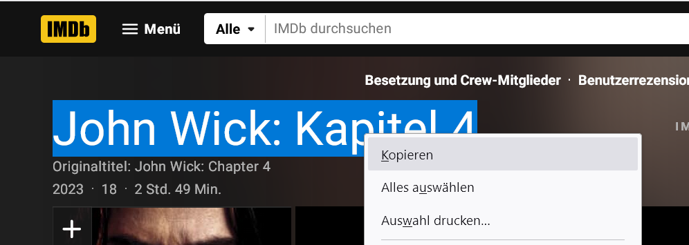 In Beitrag #3 den Text "John Wick - Kapitel 4 IMDb" mit der Maus von rechts nach links kopieren, Rechtsklick auf Google-Suche nach "...", im neuen Tab auf der neuen Webseite auf die gesuchte Webseite klicken, meistens das erste Suchergebnis, und dort den gesuchten Filmtitel markiere, dann ist die Kopier-Funktion ausgegraut.