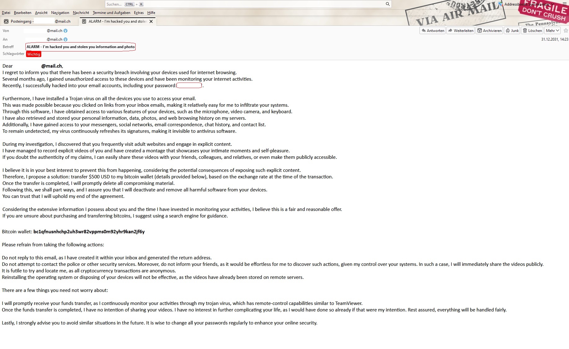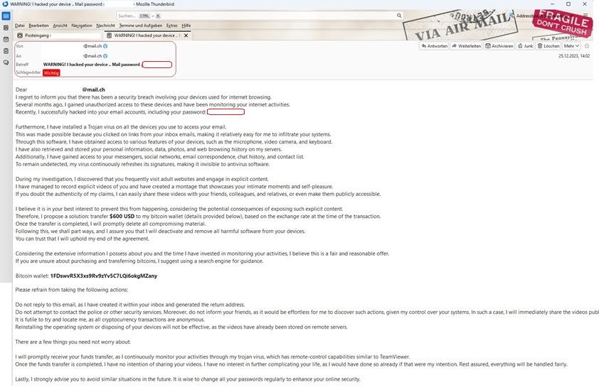 Am 17.12.23 hatte ich bei dem einen Mail.ch-Account ein neues 13-stelliges PW mit Buchstaben, Zahlen und Sonderzeichen wie Klein-/Gross-Schreibung gesetzt. Das vorherige war auch 13-stellig. Die Spoofing-E-Mail vom 25.12.23 zeigte das alte PW an.