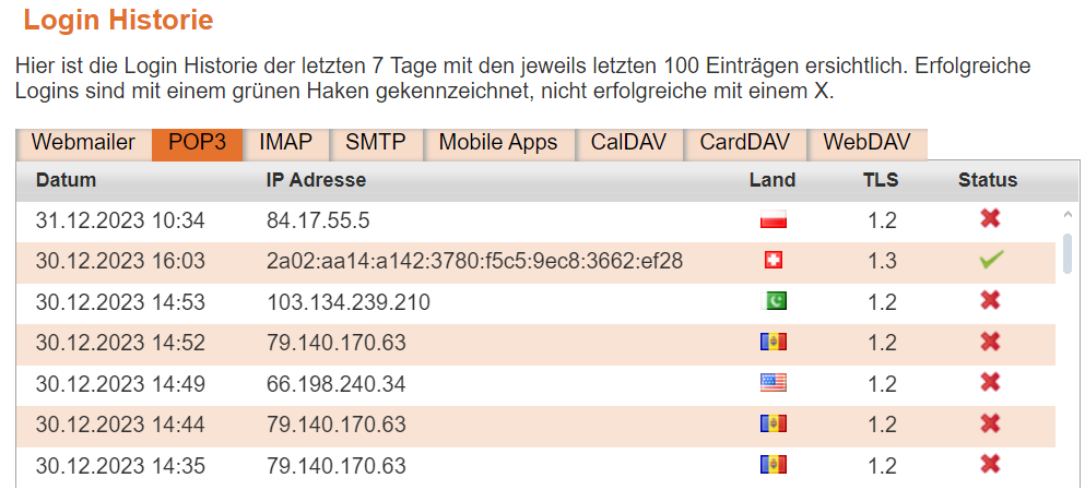 • ...Das waren die neuen Login-Versuche seit dem 30.12.23 über POP/IMAP bei der einen E-Mail-Adresse beim Provider Mail.DE resp. Mail.ch in der Login-Historie: