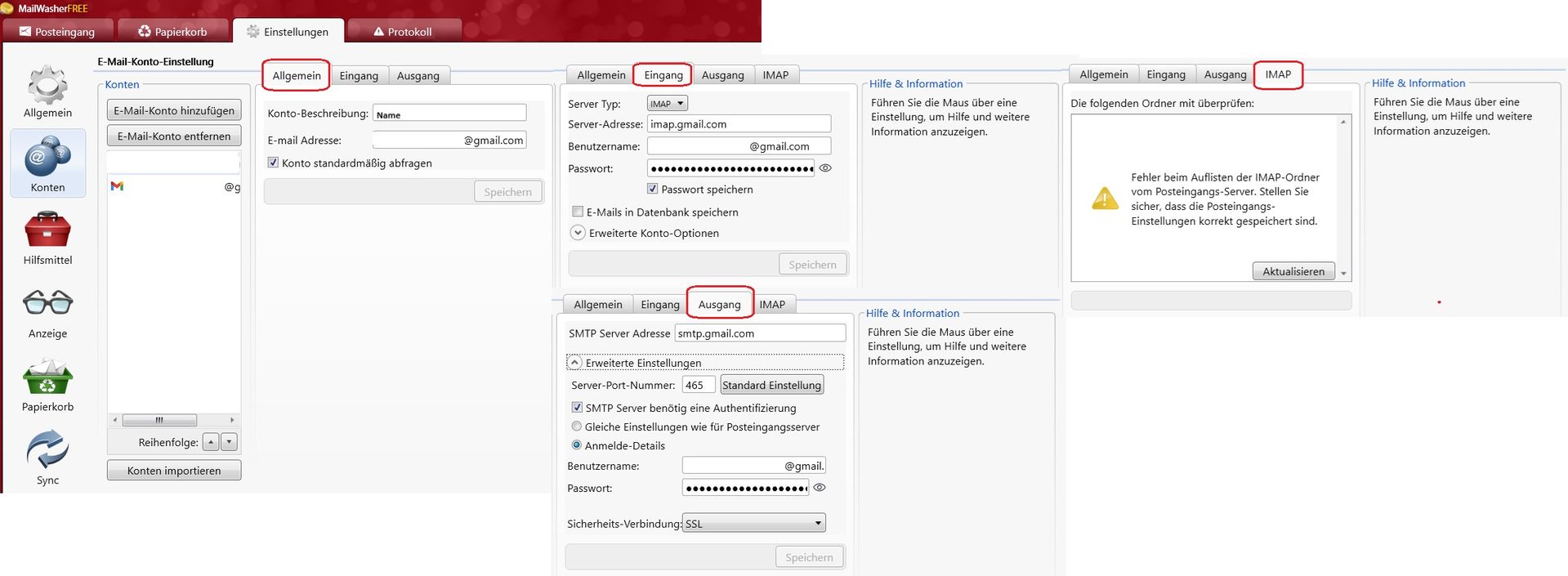 Das Passwort wurde im MailWasher korrekt eingegeben für die gmail-Adresse und die Servereinstellungen für Postausgang: "imap.gmail.com" (Port 993) und Postausgang: "smtp.gmail.com" (Port 465) sind eingetragen...