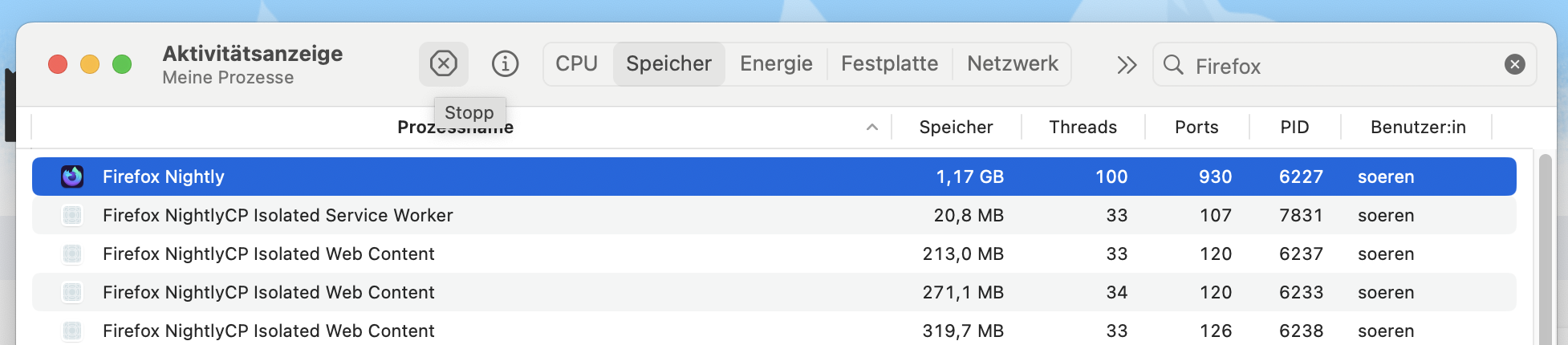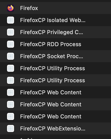 • toni-s , genau das habe ich u. a. gemeint. Den Punkt erreicht man auch mit "Apfel" in der Menüleiste > "Sofort beenden". Damit beendest du allerdings nicht alle Prozesse von Firefox. Schau mal in der, auch von Sören Hentzschel erwähnten Aktivitätsanzeige nach (findest du im Programmeordner > Dienstprogramme). Da hab ich z. B. folgende Prozesse von Firefox aktiv: