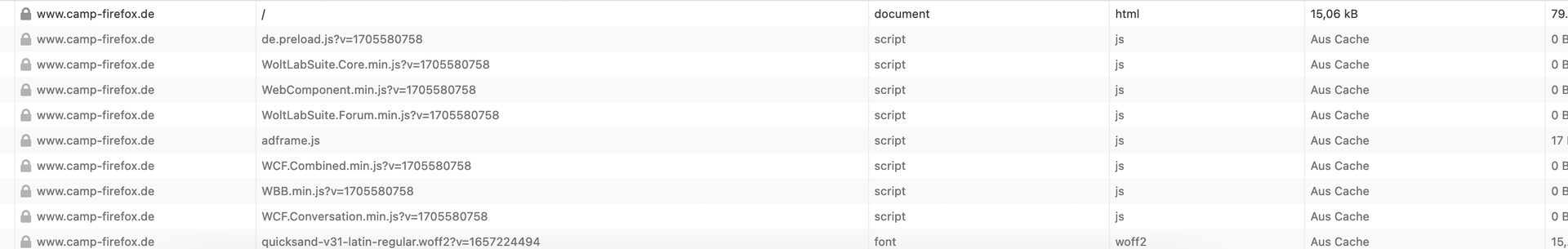 Bis auf das HTML ist alles „Aus Cache“. Das sind nur für die Startseite von camp-firefox.de (der Screenshot zeigt nicht alles) 19 Ressourcen, die immer die gleichen sind und sich nicht verändern. Und das ist jetzt nur ein vereinfachtes Beispiel der Startseite. Durch die Threads kommen ja beispielsweise noch die ganzen Benutzer-Avatare dazu. Die lädst du jedes Mal, wenn du camp-firefox.de nach einem Browser-Neustart besuchst, neu aus dem Internet herunter, statt die Ressourcen zu nutzen, die du bereits heruntergeladen hast. Und Entsprechendes gilt für alle Websites, die du besuchst. Es geht grundsätzlich um Bilder, Stylesheets, Scripts und Schriften, die sich eher selten als regelmäßig verändern.