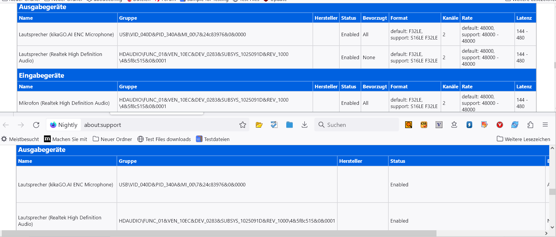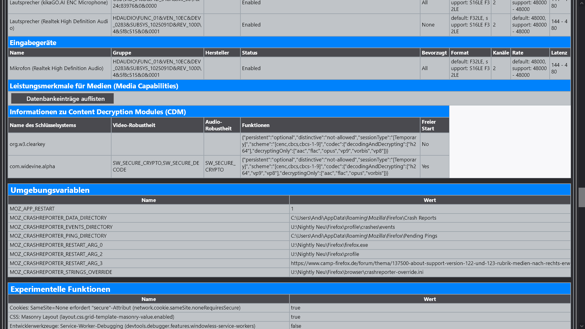 Das ist jetzt aus dem frischen Profil. Aber im produktiven Profil sieht es auch nicht anders aus. Ich habe dort auch keine Anpassungen für about:support. Ich hätte das gern für euch im frischen Profil auf Deutsch angeboten, aber ich habe da in den Einstellungen keine Möglichkeit, die Sprache umzuschalten, obwohl ich von archive.mozilla.org das deutsche Sprachpaket installiert habe. Im produktiven Profil geht es. Warum geht das nicht im frischen Profil? ![]()