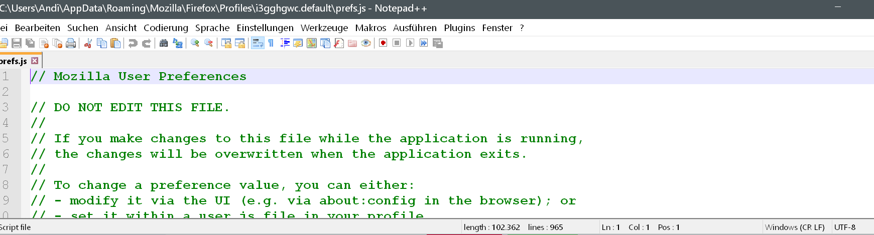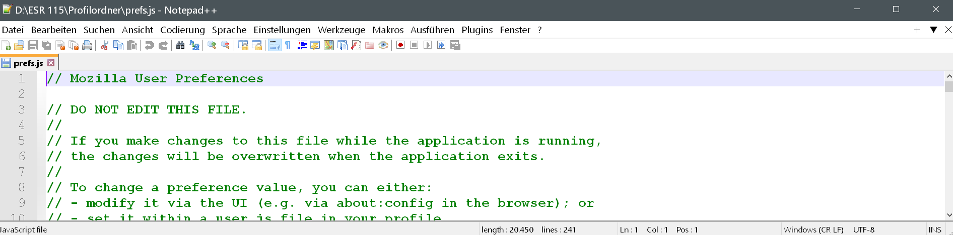 Bei mir sind die (genutzten) prefs alle ausnahmslos in ANSI. Firefox schreibt das auch so, siehe oben. Bei Thunderbird ist das UTF-8. Ich habe keine Ahnung, warum. Eine neue ist in UTF-8. Ergo muss ja dann was in meiner prefs stehen, was Firefox dazu zwingt, als ANSI zu schreiben. merde
