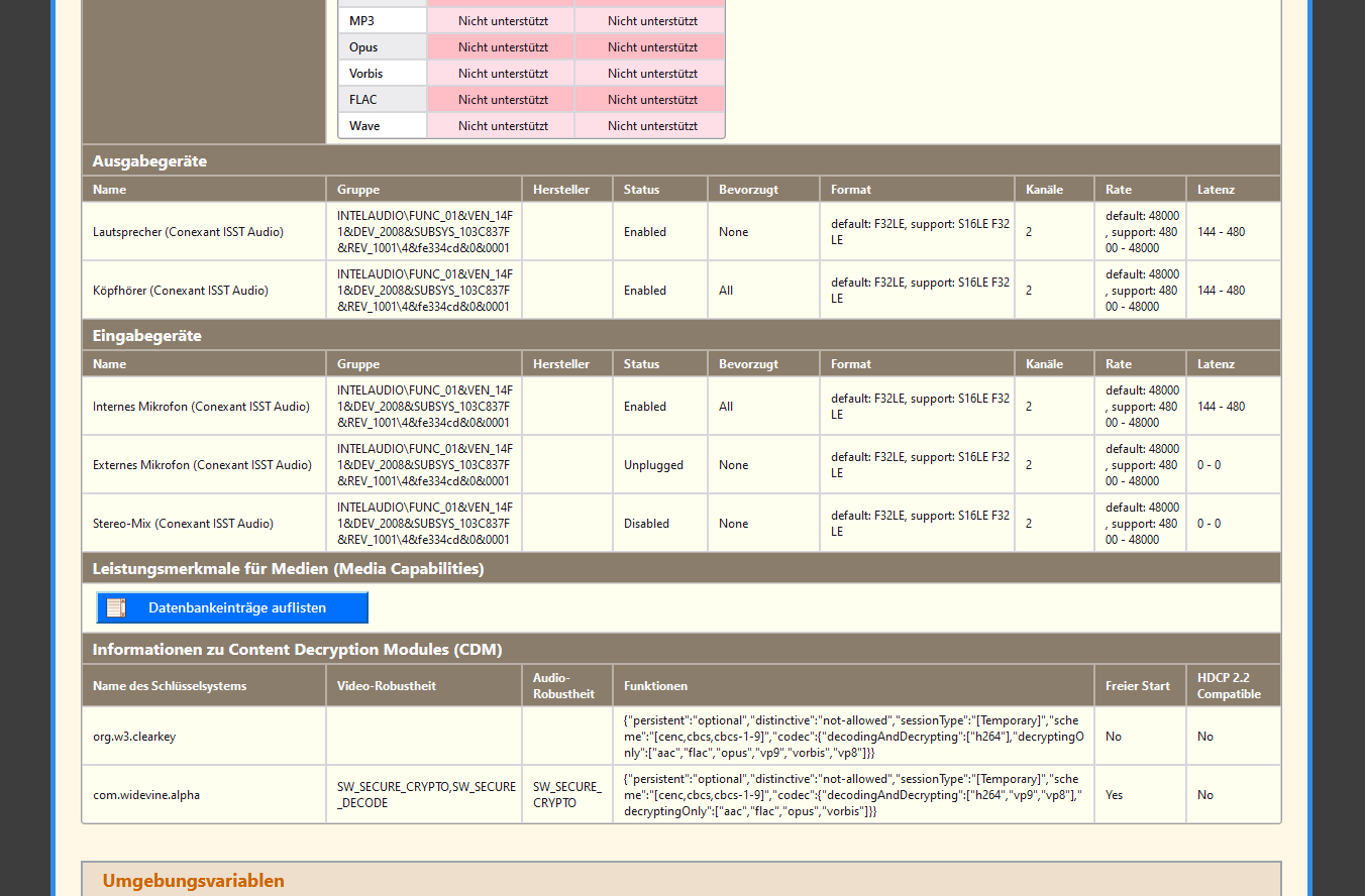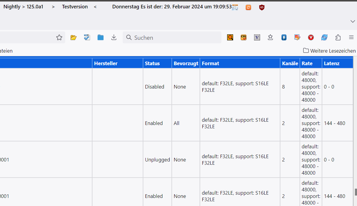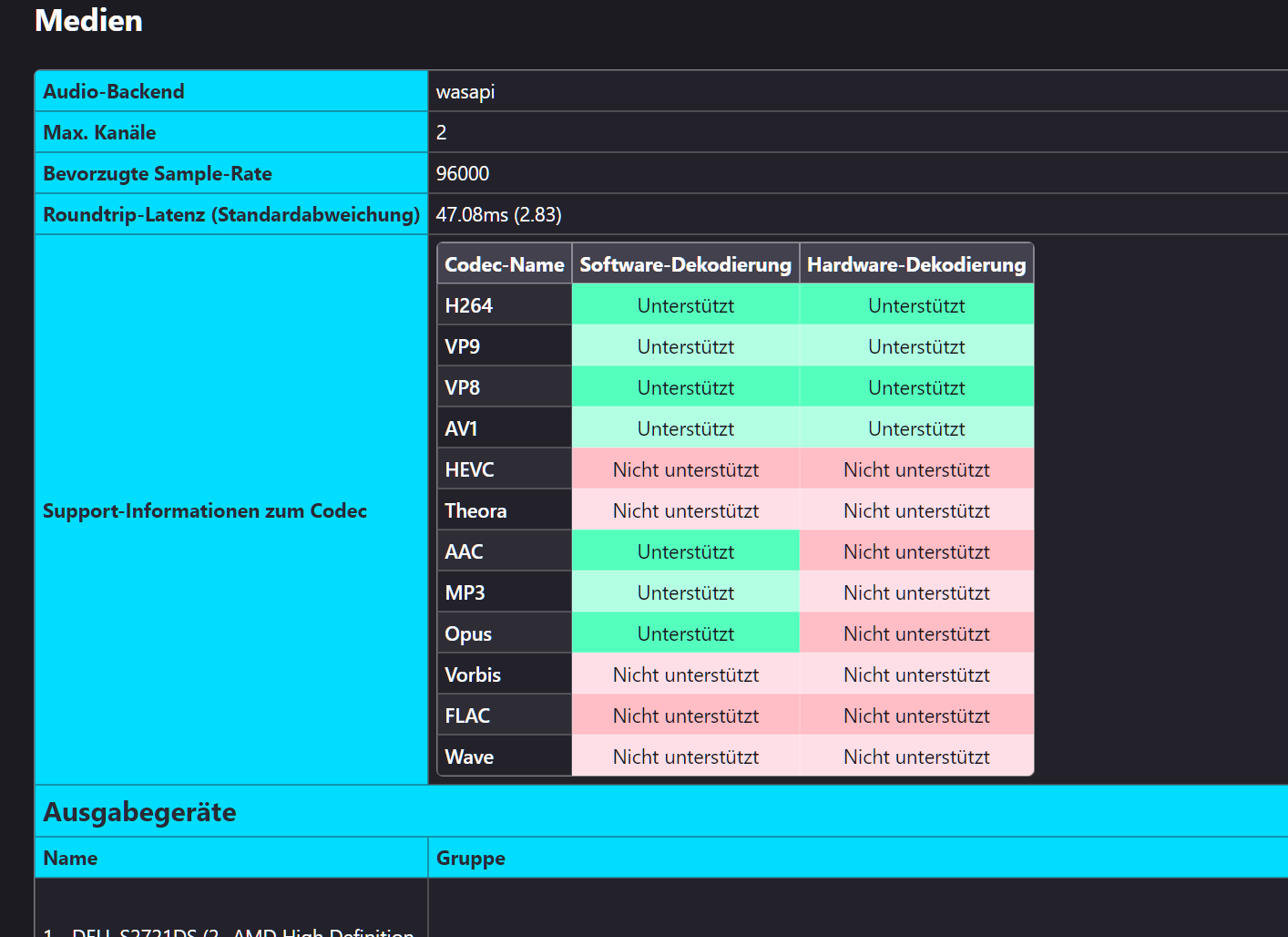 Bei der Rubrik Ausgabegeräte rauscht es rechts über den Rand.