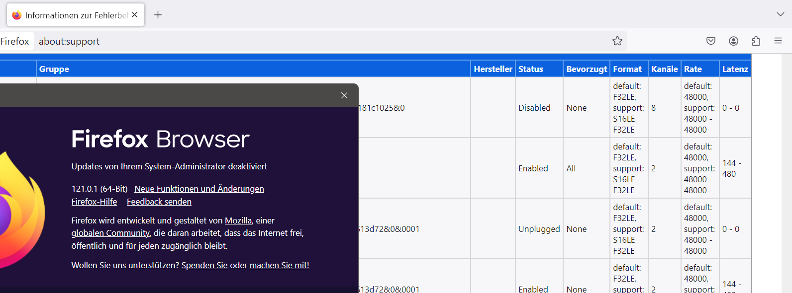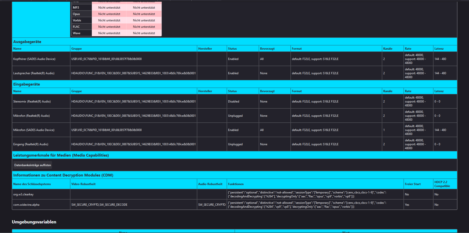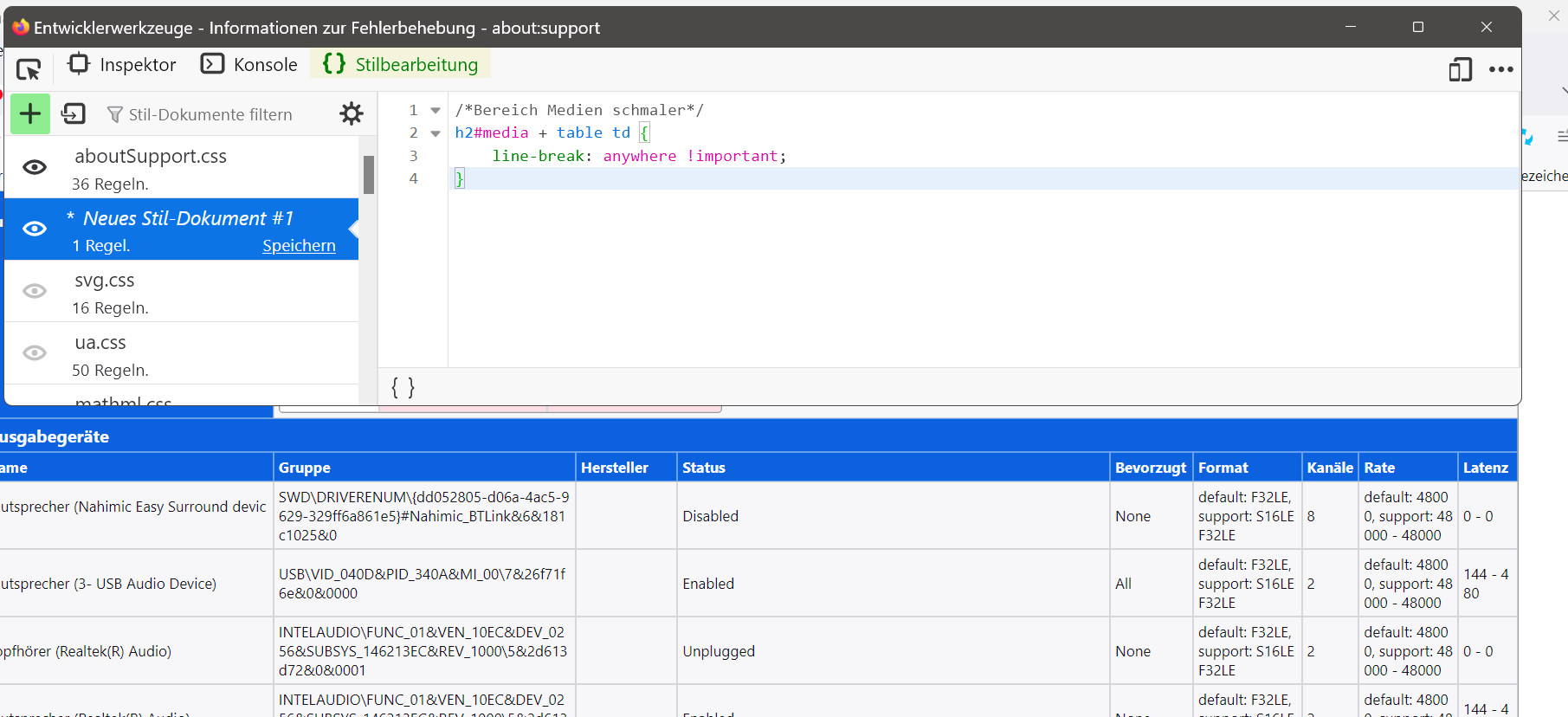 Bei der Rubrik Ausgabegeräte rauscht es rechts über den Rand.