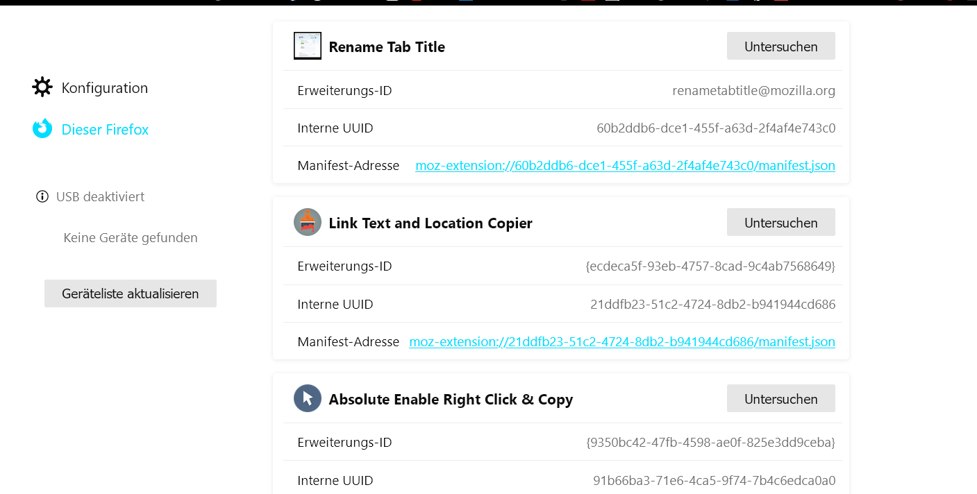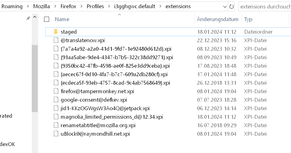 Ich habe ein leeres Addon, ich weiß nicht was es macht, Es könnte mit ein paar anderen Problemen die ich momentan habe (zufällige crashes etwa ein mal pro Tag, weiterleiten auf google suche, anstatt dem Link zu folgen) zusammenhängen, vielleicht auch nicht. Reinstallieren von Firefox half nicht, und da ich die Fehler zeitlich nicht vorhersehen kann, kann ich es auch schwer im abgesicherten Modus testen. Ich kann das addon weder entfernen noch ausschalten, es hat keine Beschreibung oder sonst etwas. Die Erweiterungs ID lautet: {2ED24B7C-73F9-42A5-BB3B-AC9DA782F7F3}. Das manifest habe ich als txt angehängt.