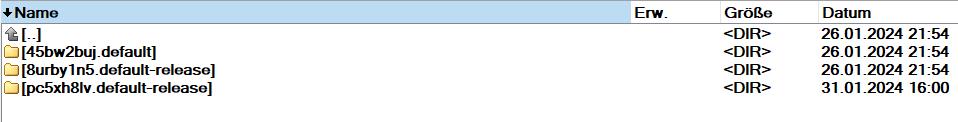 • Luna-1 Wenn außer dem Standardprofil keine weiteren angezeigt werden, stammen die restlichen auf Deiner Platte wohl von älteren Firefox-Versionen, im Prinzip kannst Du diese löschen. Das Profil mit dem heutigen Datum (26.01.2024) aber bitte nicht, denn das brauchst Du noch :)
