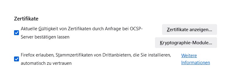 • In den Einstellungen - Datenschutz & Sicherheit - Zertifikate, ist die Option "Firefox erlauben, Stammzertifikaten von Drittanbietern, die sie installieren, automatisch zu vertrauen" zwar mit Haken aktiviert....