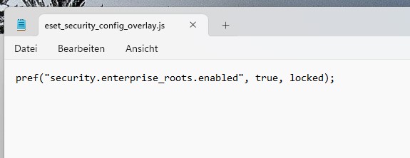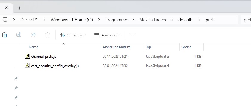 Dabei legt ESET im Firefox Ordner c:\Programme\Mozilla Firefox\defaults\pref die Datei eset_security_config_overlay.js