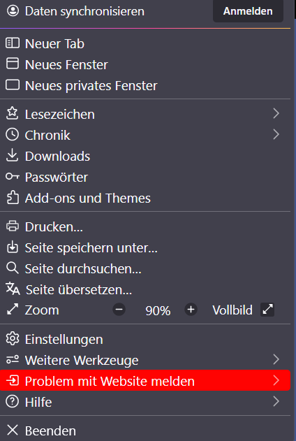 Neuer Eintrag: "Problem mit Webseite melden" nicht überall vorhanden
