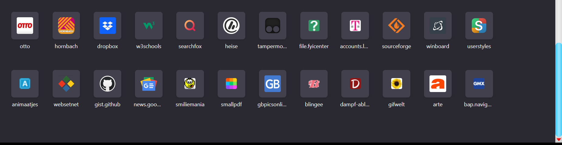 Ich weiss, dass man in about:config die Anzahl Reihen bestimmen kann, aber das Ding ist, dass so eine "Reihe" eigentlich 8 Kacheln sind, es sind gar keine Reihen. Ich habe about:home so verändert (mittels usercontent.css), so dass ich 10 Kacheln pro Zeile habe. Wenn ich nun in about:config 9 Reihen eingestellt habe, habe ich aber gar keine 9 Reihen mehr, sondern nämlich nur noch 8 reihen, bei denen die 8. nur aus 2 Kacheln besteht (Firefox geht davon aus, dass eine Reihe immer 8 Kacheln hat und erzeugt deswegen bei 9 Reihen 9*8=72 Kacheln. Das ergibt mir dann bei 10 Kacheln pro Zeile aber 7 ganze und eine Zeile mit nur 2 Kacheln).