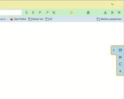 Alles anzeigen// Toggle newtoolbar 10 rechts/links, extra button instead of hover, button inside // 00_flybar_V10bi.uc.js (function() { if (location.href !== 'chrome://browser/content/browser.xhtml') return; // Custom Icon, expected in profile-name/chrome/icons folder ("icons" folder needs to be created) let ButtonIcon = 'flower-satt32.png'; // start positions let Fly_Position = 0; // 0 = right , 1 = left let Fly_InOrOut = 0; // 0 = bar extended , 1 = bar collapsed let ProfilePath = PathUtils.toFileURI(PathUtils.join(PathUtils.profileDir)); let IconPath = '/chrome/icons/'; let ImagePath = ProfilePath + IconPath + ButtonIcon; let flybox_new = document.createXULElement('toolbox'); flybox_new.setAttribute('orient','horizontal'); flybox_new.setAttribute('id','flybox_new'); let tb = document.createXULElement('toolbar'); let tb_label = "New Toolbar"; tb.id = 'new_flybar'; tb.setAttribute('customizable', true); tb.setAttribute("class","toolbar-primary chromeclass-toolbar browser-toolbar customization-target"); tb.setAttribute('orient', 'vertical'); tb.setAttribute('mode', 'icons'); tb.setAttribute('context', 'toolbar-context-menu'); tb.setAttribute("toolbarname", tb_label); tb.setAttribute("label", tb_label); flybox_new.appendChild(tb); document.getElementById('browser').parentNode.appendChild(flybox_new); CustomizableUI.registerArea('new_flybar', {legacy: true}); CustomizableUI.registerToolbarNode(tb); try { CustomizableUI.createWidget({ id: 'NewToolbar_fly_button', type: 'custom', defaultArea: CustomizableUI.AREA_NAVBAR, onBuild: function(aDocument) { let toolbaritem = aDocument.createXULElement('toolbarbutton'); let props = { id: 'NewToolbar_fly_button', class: 'toolbarbutton-1 chromeclass-toolbar-additional', removable: true, label: 'Toggle New Toolbar', tooltiptext: 'Toggle New toolbar', style: 'list-style-image: url("' + ImagePath + '");', }; for(let p in props) toolbaritem.setAttribute(p, props[p]); return toolbaritem; } }); } catch(e) { }; document.getElementById('NewToolbar_fly_button').addEventListener( "click", flybar ); function flybar() { if (event.button === 0 ) { new_flybar.classList.toggle("fly_off_mode"); } }; if (Fly_Position === 1) { flybox_new.classList.add("fly_left"); } else { flybox_new.classList.remove("fly_left"); }; try { CustomizableUI.createWidget({ id: 'ntb_flyInOut_btn', defaultArea: CustomizableUI.AREA_NAVBAR, tooltiptext: 'Fly Me', label: 'Fly Me', removable: false, }); } catch(e) { } if (Fly_InOrOut === 1) { flybox_new.classList.remove("fly_InOut_mode"); } else { flybox_new.classList.add("fly_InOut_mode"); }; // 1st child let addy = document.getElementById('new_flybar'); let addybe = document.getElementById('ntb_flyInOut_btn'); addy.insertBefore(addybe, addy.firstChild); document.getElementById('ntb_flyInOut_btn').addEventListener( "click", flyInOut); function flyInOut() { if (event.button === 0 ) { flybox_new.classList.toggle("fly_InOut_mode"); } }; const css =` /* Botton inside */ :root { --ug-newbar_width: 0px; --ug-newbar_inner_width: 38px; /* minimum 32px */ --ug-newbar_max_width: calc(var(--ug-newbar_inner_width) + 2*var(--ug-fly_border)); --ug-arrow_left: url(chrome://global/skin/icons/arrow-left.svg); --ug-arrow_right: url(chrome://global/skin/icons/arrow-right.svg); --ug-newbar_bg_color: lightblue; --ug-newbar_radius: 8px; --ug-fly_border: 3px; --ug-fly_border_color: orange; } #flybox_new { position: fixed; display: flex; top: 50%; right: 0px; transform: translateY(-50%); z-index: 4 !important; height: fit-content; width: fit-content; } #ntb_flyInOut_btn, #new_flybar { display: flex; min-width: 0px !important; width: var(--ug-newbar_width); justify-content: center !important; background-color: var(--ug-newbar_bg_color) !important; border-color: var(--ug-fly_border_color); border-style: solid !important; border-width: var(--ug-fly_border); transition: width 0.5s ease, margin 0.5s ease, padding 0.5s ease, border-radius 0.5s ease; } #new_flybar { min-height: var(--ug-newbar_max_width) !important; border-radius: 0 0 0 var(--ug-newbar_radius); overflow: hidden !important; border-top-color: transparent; padding-block: 4px 4px; margin-inline: 0px calc(0px - 2*var(--ug-fly_border)); } #flybox_new.fly_InOut_mode #new_flybar:not([customizing]) { width: var(--ug-newbar_max_width); margin-inline: 0px calc(0px - var(--ug-fly_border)); } #new_flybar > :is(.toolbarbutton-1, toolbaritem), #new_flybar toolbarpaletteitem > :is(.toolbarbutton-1, toolbaritem) { margin-inline: 0px !important; margin-block: 2px !important; padding-inline: 0px !important; z-index: 6 !important; } #new_flybar:not([customizing]) toolbarbutton:not(#ntb_flyInOut_btn) { transition: opacity 0.25s ease; opacity: 0 !important; } #flybox_new.fly_InOut_mode #new_flybar toolbarbutton { opacity: 1 !important; } /*--- arrow button ---*/ #ntb_flyInOut_btn { position: absolute; list-style-image: var(--ug-arrow_right); top: calc(0px - 32px - 6px - 0*var(--ug-fly_border)); right: calc(0px - var(--ug-fly_border)); width: var(--ug-newbar_max_width); border-radius: var(--ug-newbar_radius) 0 0 var(--ug-newbar_radius); } #flybox_new.fly_InOut_mode #ntb_flyInOut_btn { border-radius: var(--ug-newbar_radius) 0 0 0; } #flybox_new:not(.fly_InOut_mode) #ntb_flyInOut_btn::after { width: 0px; } #flybox_new:not(.fly_InOut_mode) #ntb_flyInOut_btn { list-style-image: var(--ug-arrow_left) !important; width: calc(var(--ug-newbar_max_width) - 12px); } #ntb_flyInOut_btn image { margin-block: 6px !important; transition: width 0.5s ease !important; } #flybox_new:not(.fly_InOut_mode) #ntb_flyInOut_btn image { --toolbarbutton-inner-padding: 8px 2px !important; } /* gap */ #flybox_new #ntb_flyInOut_btn::after { content:""; /* display: none; */ position: absolute; background: linear-gradient(to right, var(--ug-fly_border_color) var(--ug-fly_border), var(--ug-newbar_bg_color) var(--ug-fly_border)); bottom: calc(0px - 1*var(--ug-fly_border)); right: calc(0px - 0*var(--ug-fly_border)); width: calc(100% + var(--ug-fly_border)); height: va