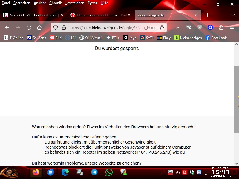 seit Wochen werde ich bei Kleinanzeigen (Ebay Kleinanzeigen) gesperrt wenn ich die Seite mit Firefox aufrufe. Ich bin mir eigentlich sicher das es nicht an Firefox liegt. Hat hier jemand die gleiche Erfahrung gemacht und hat evtl. eine Lösung daafür, bzw. kennt die Gründe warum es mit Firefox nicht funktioniert ?